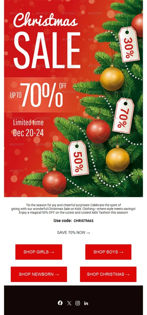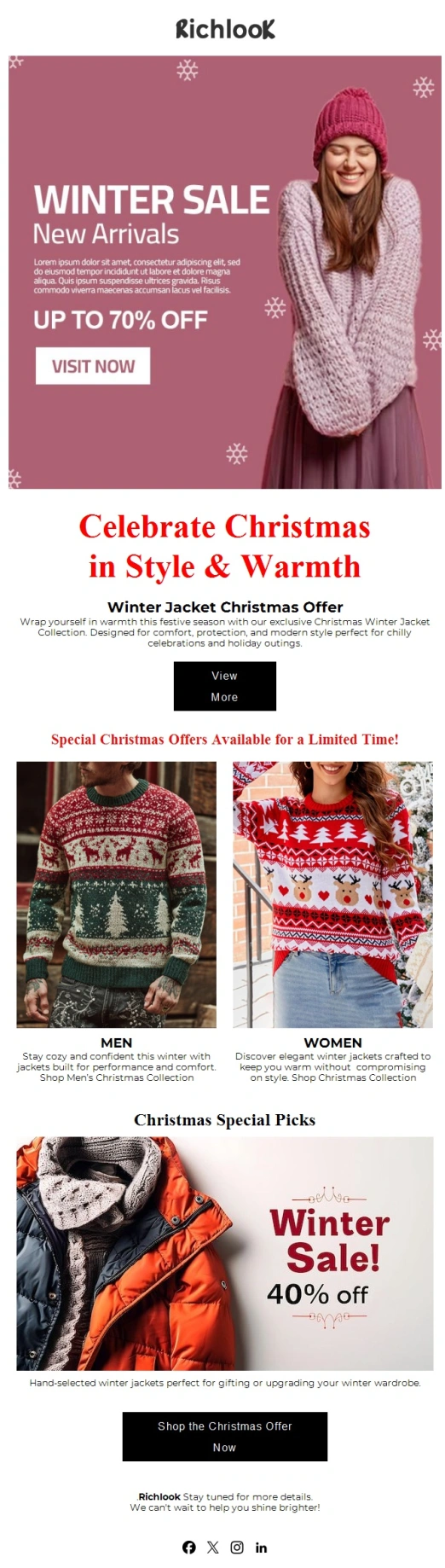 A timeless christmas email design approach that highlights seasonal collections with bold visuals and irresistible discounts.