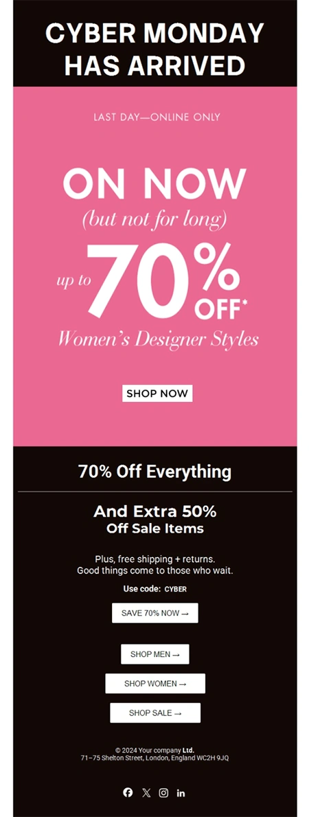 A sleek black-and-pink palette delivers a premium fashion feel. The dominant “70% Off” headline ensures instant engagement, while multiple CTAs (Men / Women / Sale) make browsing effortless. The coupon code placement reinforces urgency and clarity.